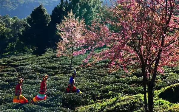 遠(yuǎn)遠(yuǎn)望去,一排排茶樹像一條條綠色的絲帶,縈繞于山間,一樹樹嬌美的粉色櫻花點(diǎn)綴其間,煞是好看。