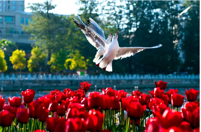 隨著公園西區(qū)長聯(lián)文化大道上銀杏漸黃,臨水區(qū)域就會飛來了首批安家的紅嘴鷗。