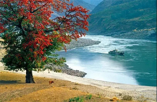 火紅的樹葉、枯黃的茅草、清淺的江水