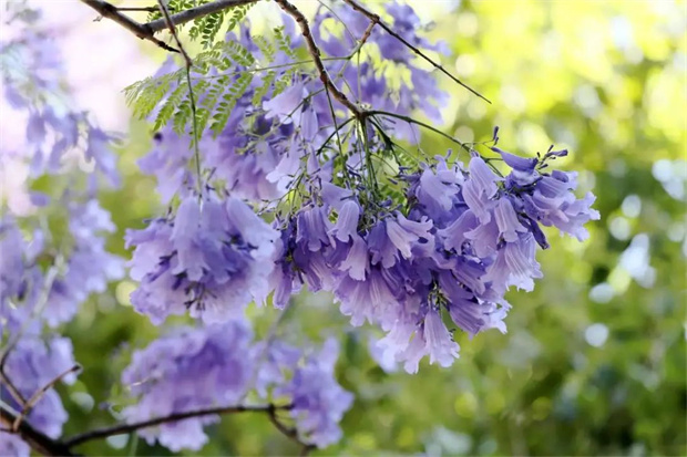 花楹樹覆蓋;盤龍江畔的藍花楹樹高大挺拔,樹冠寬廣,總是飄落著“紫雨”;在云南大學,百年建筑與藍花楹瀑布交相
