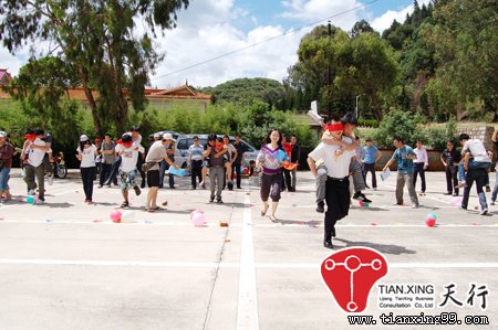 (2)、通過抽簽決定出對戰的防與守雙方,如紅隊VS黃隊 ,紅隊做防守方,可自行安排4個隊員,兩兩組合成兩個組,兩人背對呼啦圈,把呼啦圈系于腰間,而黃隊全體隊員待命在指定區域外進攻,4人一組,如果最后一組沒有四人有多少人算多少人,每人只有一次進攻投球的機會,在紅隊瞬息變幻的過程中投入到紅隊背后的呼啦圈里,最后黃隊全體隊員進攻結束,與紅隊交換角色,最后每隊的成績以進攻進球的個數多者勝。拓展游戲:齊步行進,全隊左腿要沒有縫隙的綁到一起向目標進發。當大家用力不均時,全隊就無法前行;各腿間的縫隙大時,全隊將被叫停,重新整隊,并經過檢查合格后才可繼續前行。當游戲結束時有的人腿已經勒得紅紅的,可是就在剛才,竟然沒有人能察覺到,是因為他們太專注了,這樣的深刻經歷就這樣不僅寫在了他們的身體上,也寫在了他們的心靈里。要想達到目標,大家必須步伐一致,才能又快又穩地沖刺,達到目的地,同時細節上到位才不至于影響全局。