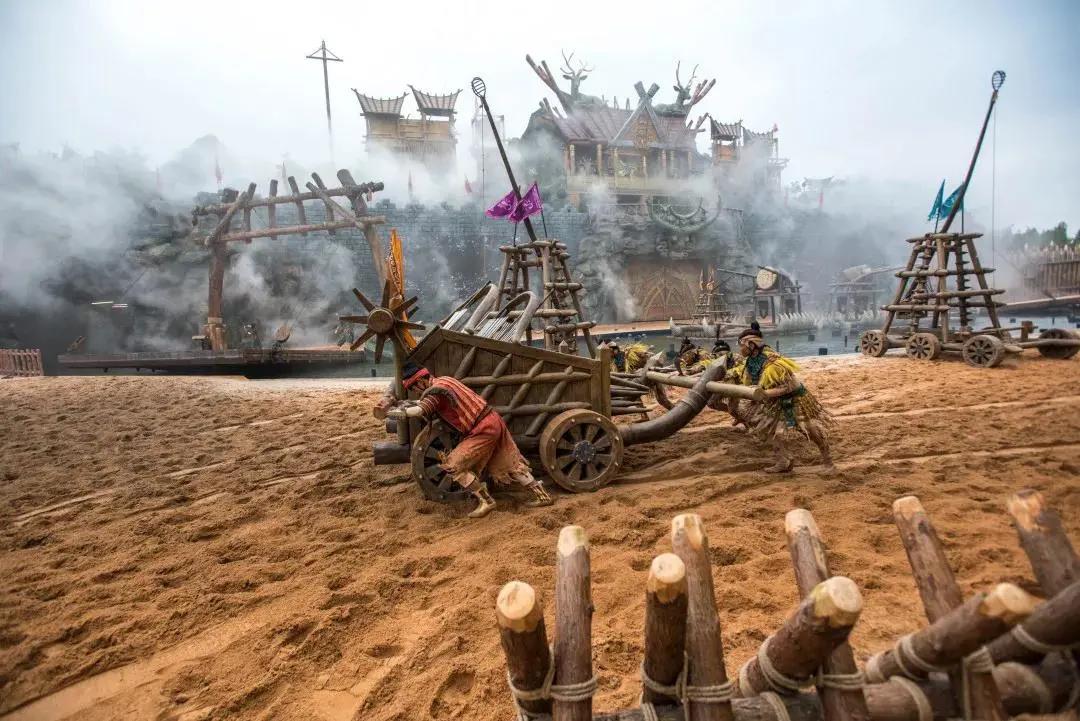 眼前烈馬嘶鳴、士兵沖鋒、滾木擂石、捉對廝殺。配合相應的節奏,現場還加入了許多煙、火、水、聲的特效,如:現場彌漫的煙塵,兵器撞擊的鏗鏘之聲,從水中突然噴出的火焰,水柱沖天而起,激起的水花有時還會濺到前排的觀眾,讓戰爭的場面顯得宏大華美而又驚心動魄,具有極強的“帶入感”。