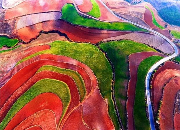 東川紅土地景區,位于云南省昆明市東川區紅土地鎮,獨特的紅色土壤成片地覆蓋在蜿蜒起伏的山地上,與綠色的莊稼、銀灰色的道路、白色的村莊等交相錯雜,形成了一幅幅色彩斑斕、絢麗多姿的巨幅“油畫”。