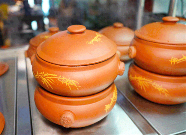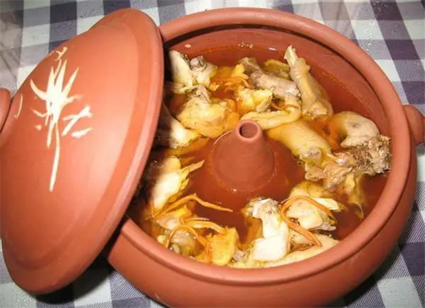 汽鍋雞的烹飪,需用建水陶特制的汽鍋慢慢蒸制。蒸汽會(huì)通過汽鍋中的汽嘴將雞蒸熟,凝結(jié)成水的蒸汽就變成湯汁。