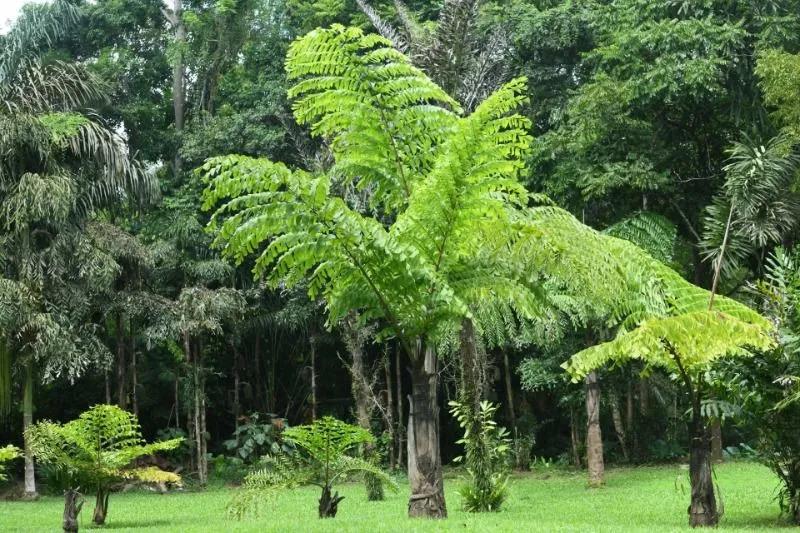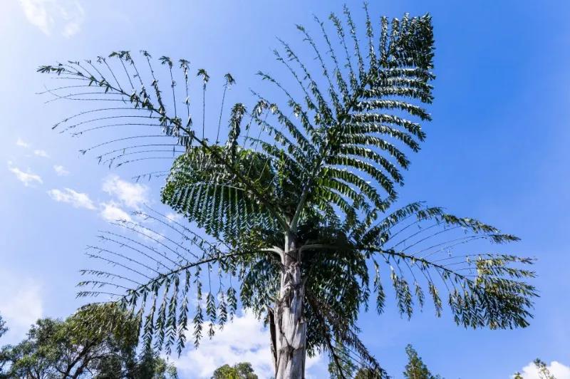 董棕也是熱帶雨林中的一員,生于石灰巖山地區或溝谷林中,云南西雙版納東南部的熱帶溝谷雨林是它主要的分布區域之一。它高可達三十余米,即使熱帶樹木普遍高大,董棕也能“木秀于林”。葉片長可至七八米,寬可至五米,比小巴車還要大。十余片葉片聚生于頂端,真如巨傘一般。