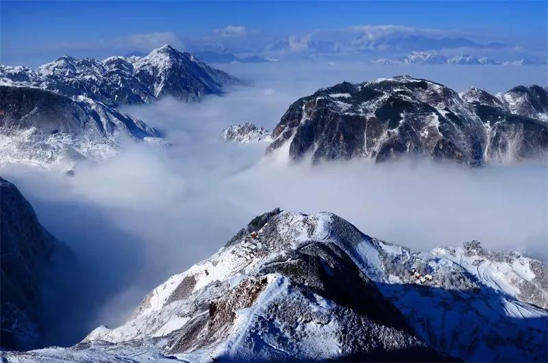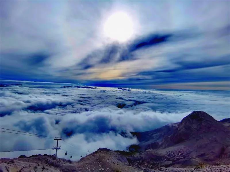 當浩瀚的云海在玉龍雪山奔涌之時,整個山區形成茫茫海面,只留巍峨的山峰,像點點島嶼漂浮不定。柔柔的云海,時而滾作一團團棉絮,時而化作長長的綾羅,繞著這個山峰飄忽而來,又悠然地從另一處山峰飄忽而去。云海搭配藍天、微風,瞬間便讓煩惱一掃而空,留下的只有快意舒適。