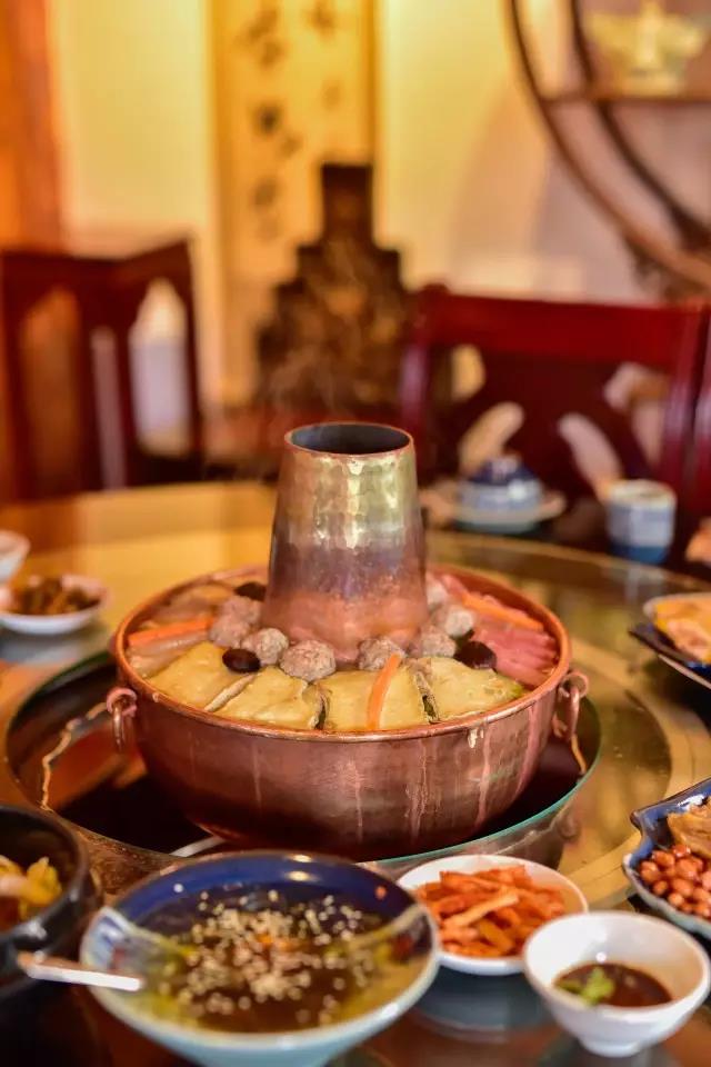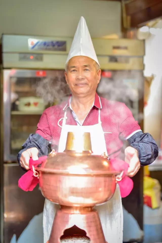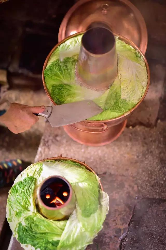 先將熬制好的高湯盛入銅鍋,放入些許鹽、胡椒等調(diào)料,舀入幾勺豬油,蓋上鍋蓋,在煙囪中加入無(wú)煙碳生火,等待高湯煮沸。高湯由店主憑借自己幾十年的經(jīng)驗(yàn),獨(dú)家熬制。“放入土雞、排骨、筒子骨、老鴨同煮,水沸之時(shí),拂去沫子,待用筷子能戳穿肉時(shí)取肉,再等雞能被戳穿時(shí),取雞,約一小時(shí)許,然后再把筒子骨取出,涼后剔肉,肉涼拌或打蘸水食之。此時(shí)湯鮮、色白,可謂高湯。古人無(wú)味精,故用雞、骨等熬制成高湯,可當(dāng)味精,故而炊鍋一般不放味精,放適量鹽即可。”馬姐告訴我們,熬制高湯用的都是礦泉水。
