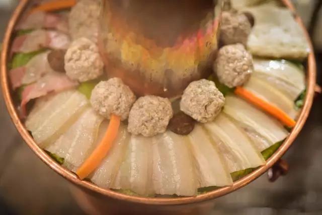 十多分鐘后,在最上面鋪上一層火腿、新鮮肉丸、臭豆腐,以及加工熟的、薄薄的三線肉,葷菜和素菜搭配合理。大概20分鐘后,炊鍋冒著熱氣就可以端上餐桌,坐等享用了。