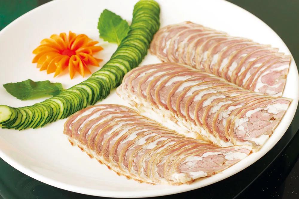 峰浪望月其實(shí)就是羊肉涼片,專(zhuān)用黑山羊的脊肉做成。把脊肉用肥肉包瘦肉的方法緊緊裹起來(lái),卷包成團(tuán),放到燜鍋里燉煮3個(gè)多小時(shí)。傳統(tǒng)的炊具是曲靖土產(chǎn)的土陶鍋,土陶鍋是鑲在爐邊的,鍋里的羊肉受到四周傳來(lái)的熱氣的熏陶,烹煮時(shí)間一到,揭開(kāi)鍋蓋,滿(mǎn)室異香。被燉得爛熟的羊肉冷定成形,切片、冷食。涼片肥瘦分明,不需要任何佐料或蘸水,已是軟香適口。峰浪望月的菜名是王天順根據(jù)菜品外觀取的。