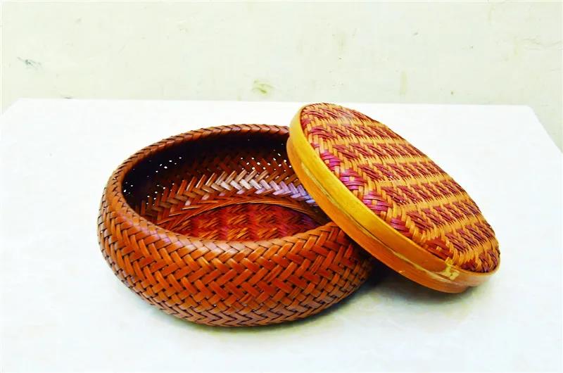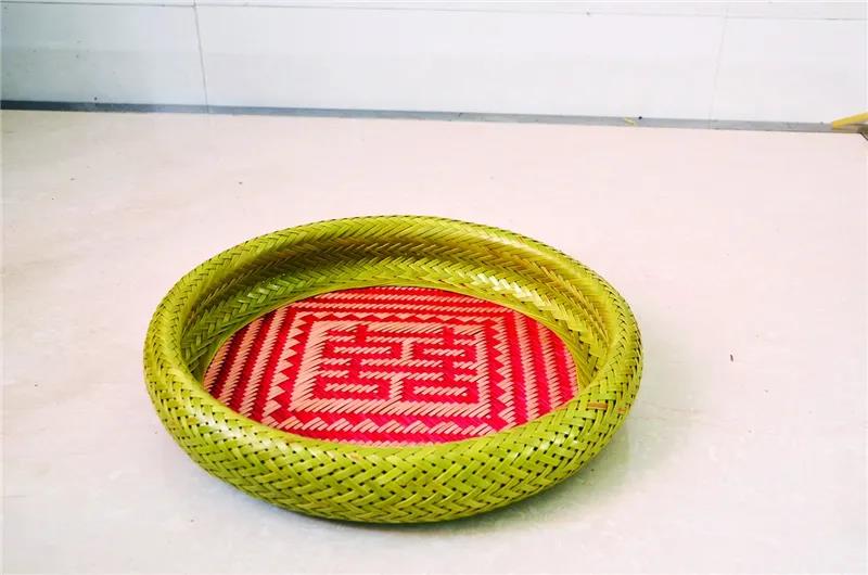 竹編工藝分細絲、粗絲兩種,編織中有起底、編織、鎖口三道工序。整個編制過程,以經(jīng)緯編法為主。在此基礎(chǔ)上,還穿插各種技法,如疏編、插、穿、削、釘、扎、套等。為使工藝品有更高的欣賞性,編制圖案要用染色配合,形成色彩對比,做出鮮艷明快的花紋。“喜“和‘“福“等吉祥字樣,以大紅大紫為主;收藏工藝品,一般要做舊,作品顏色偏深。