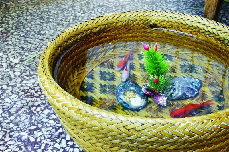 在李加云住所二樓茶幾上的竹編魚缸,頂部隨著時間的遷移有了少許磨損,但整個竹缸仍滴水不漏。魚缸里 3 條金魚腮部一張一翕,不時輕快游弋。