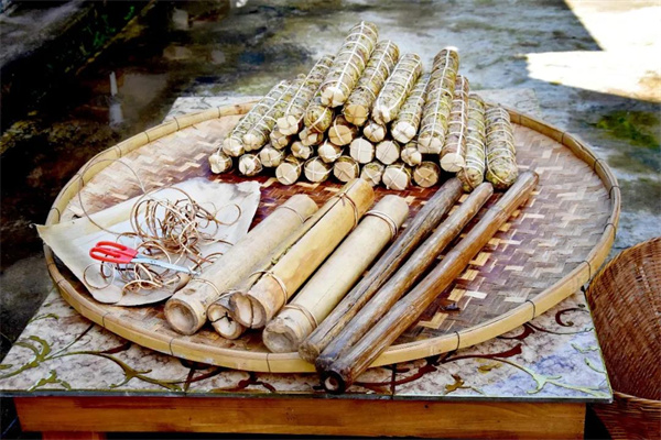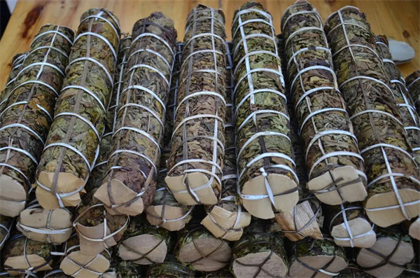 將回軟后的茶葉裝入竹筒中,用黃栗木杵舂壓造型,制成松緊適度的圓柱狀茶筒,一般規(guī)格為:筒長30-33cm左右,直徑5-6cm左右,重量約150-200g;圓柱形茶筒底部和上部用筍葉剪成與茶筒直徑大小相當?shù)膱A形小片作墊層,筒體用扎篾、青藤或葛麻藤交叉纏繞捆扎,然后干燥、包裝。
