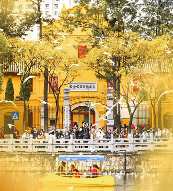 旭日東升、萬物蘇醒,晨練的人們走進處于昆明鬧市區的翠湖公園。他們穿著不同的服飾,跳著不同的舞蹈,還有不同的面容與表情,一切都是那么自然而和諧。湖面上,你可以看到各類水鳥在嬉戲和鳴,享用春城碧水的溫情。漫步翠湖之畔,你會看到一棟杏黃色的轉角式正方形建筑物,兩層土木式的樓房,讓它顯得更加古樸而莊嚴。雖然隨著歲月的變遷,建筑已經變得有些老舊,但你仰視那高聳的門樓與飛揚的檐角,就能立即感受到它曾經的威嚴與肅穆,定睛一看,門牌上赫然寫著——云南陸軍講武學校。
