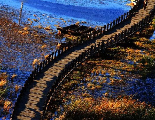 在草海上有一座古老的走婚橋,原是摩梭人約會(huì)的地方,也被稱為“天下第一鵲橋”。十月份,走婚橋兩邊的草甸也變黃了,秋風(fēng)起,把草也吹彎了腰。