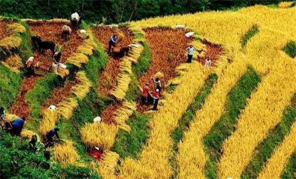 金秋的元陽(yáng)梯田,由于海拔高低不同,一座山坡的梯田形態(tài)各異、顏色不一,黃色由淺變深。這個(gè)時(shí)候是收割的時(shí)節(jié),梯田與勞作的人共同組成了一幅秋收?qǐng)D。